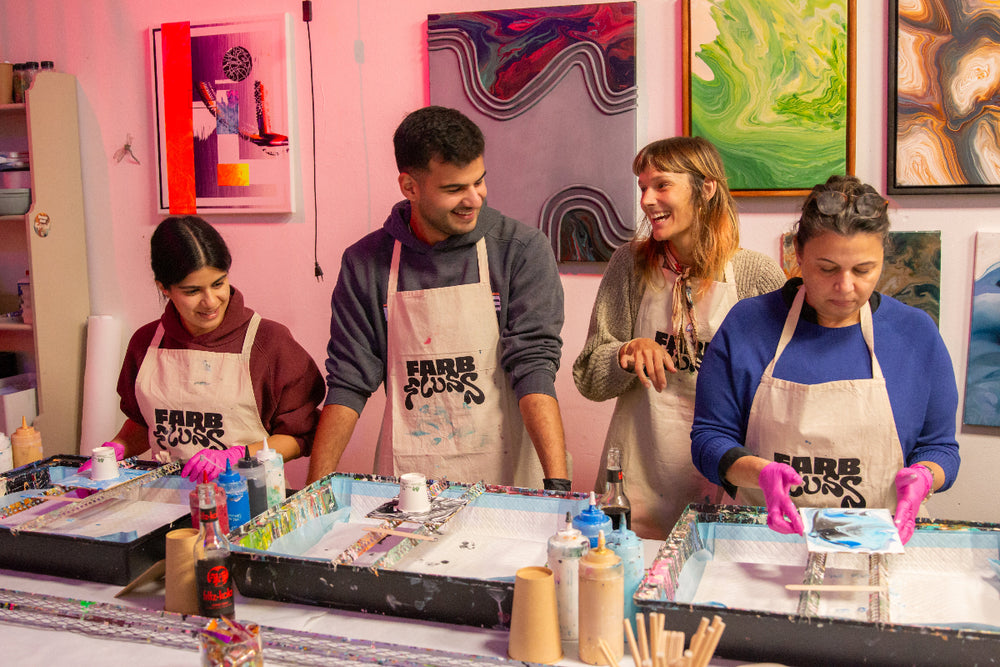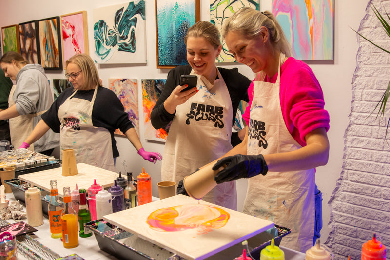 Ob allein, mit Freunden oder als Team – bei Farbfluss steht im Mittelpunkt, Kunst greifbar zu machen und einen Raum zu schaffen, in dem jede Person direkt loslegen kann.